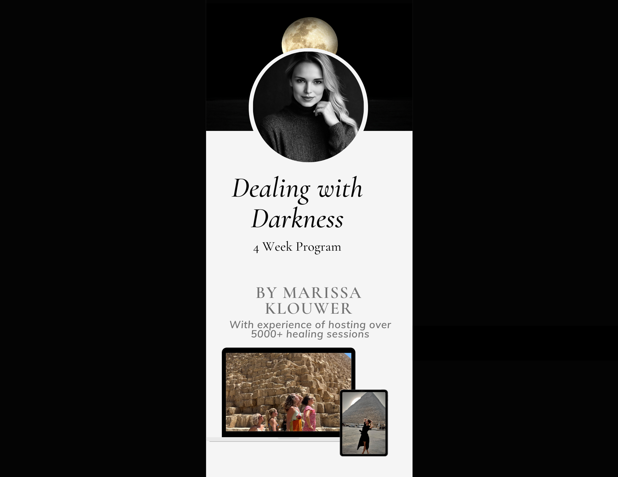 Hosted by Marissa Klouwer, a seasoned guide who has facilitated over 5,000 healing sessions, this four-week program is your gateway to understanding and leveraging the complexities of growing your healing power in life. In a world that often shies away from challenges, Marissa Klouwer invites you to embrace them, teaching you that within challenges lies untapped potential for transformation. With decades of experience in spiritual healing and personal development, Marissa has crafted a comprehensive program that delves into the nature of growing your healing power by facing darkness, its role in our lives, and its potential to catalyze significant change. Over the course of four weeks, you will go on a journey into the heart of the darkness, exploring its many facets and learning how to navigate through it with grace and strength, finding light & gold beyond the shadows.